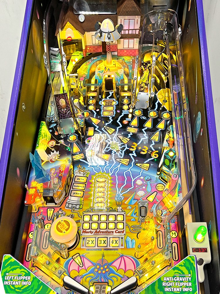 Rick and Morty Pinball Machine is by far the best game from Spooky Pinball. The game has an excellent layout, new and refreshing with a touch of difficulty. Unique yet familiar in feel. Perfect placement of features and a nontraditional bottom that seems to work well. The shots are all smooth yet appropriately challenging. The animation clips are exciting and well-choreographed to match what is happening under the glass.