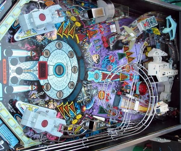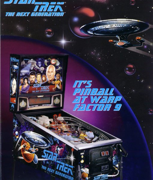 Star Trek: The Next Generation pinball machine is a widebody game, designed by Steve Ritchie and released in November 1993 by Williams Electronics. It was part of WMS’ SuperPin series (see also The Twilight Zone and Indiana Jones: The Pinball Adventure), and was based on the TV series. It is the only pinball machine that features three separate high score-lists. Apart from the regular high score-list and the buy-in-list, it also features a reminiscence to The Machine: Bride of Pin*Bot billionaires club. It is also the third pinball game overall based on the Star Trek franchise, following the 1979 pinball game by Bally, and the 1991 game by Data East (both based on the original series).